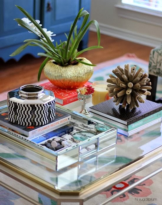Mixing metals is very in right now and having a gold or copper bowl really warms up a space. When you have a large coffee table you need an equally large bowl to keep the scale working. This is a very "masculine" look. Consider small globes, gears, wooden sculpture, carved boxes, magnifying glass, etc. for masculine additions.